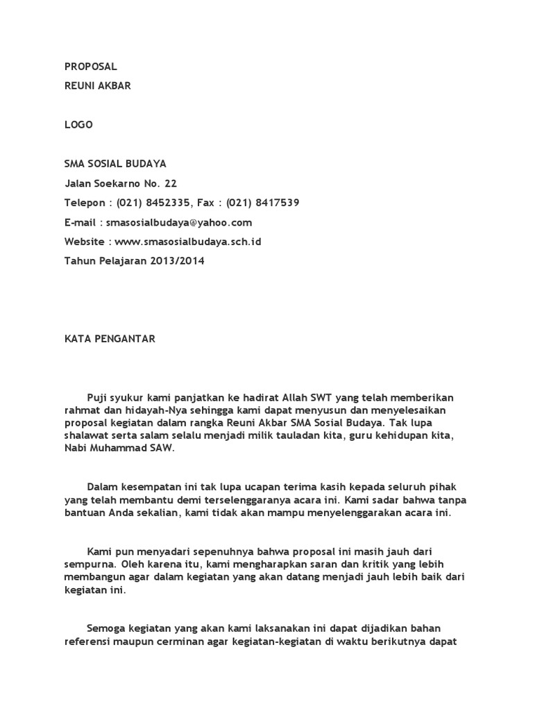 Contoh proposal reuni akbar sma, smk, ma atau yang sederajat. Proposal kegiatan untuk sekolah dibuat ketika sebuah sekolah atau lembaga pendidikan sedang melakukan suatu kegiatan. Unduh, download contoh sambutan pidato ketua panitia pelaksana reuni sekolah (sd, smp, sma, smk atau yang sederajat). Contoh proposal kegiatan pameran terlengkap dari kegiatan sekolah berupa pameran, acara pramuka, pentas seni, sampai dengan acara bakti sosial. Anak sekolah seperti pelajar, mahasiswa, bahkan orang tua yang berprofesi di dunia bisnis atau di perusahaan pasti.